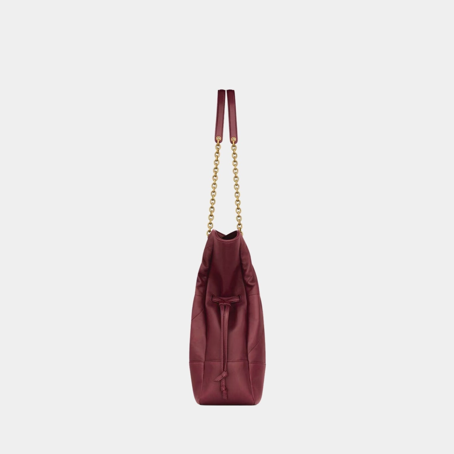 Its versatile structure allows the sides to be cinched with drawstrings for a sleek shape or expanded for extra capacity. A metal chain shoulder strap enables easy styling, while a removable zip pouch enhances functionality to keep your daily essentials organized.